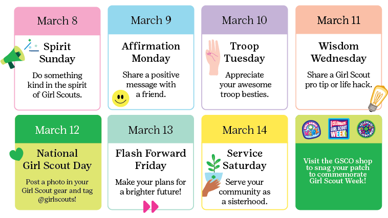 Want to share the excitement of Girl Scout week with others? Download the 2025 Girl Scout Week flyer and spread your Girl Scout spirit!